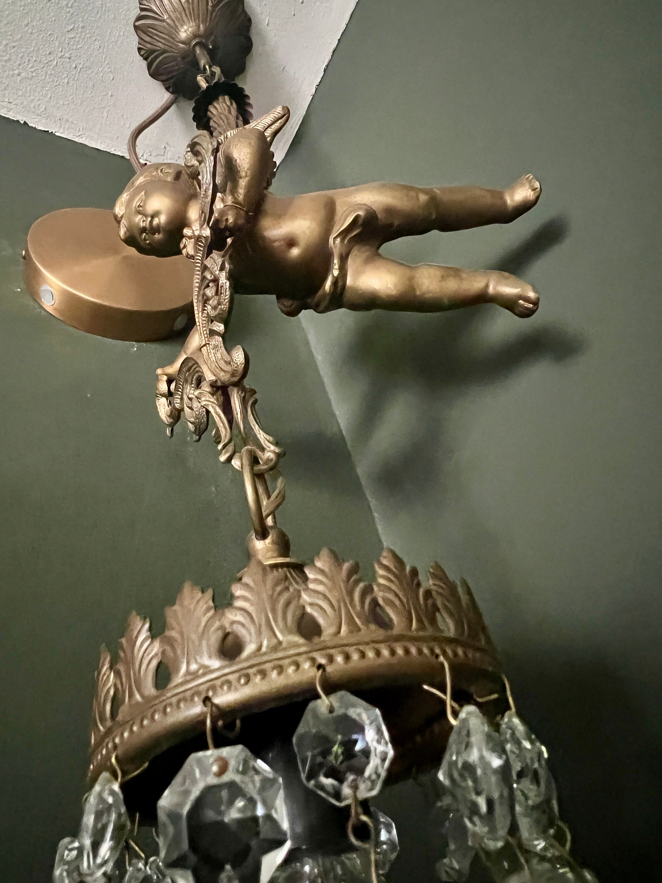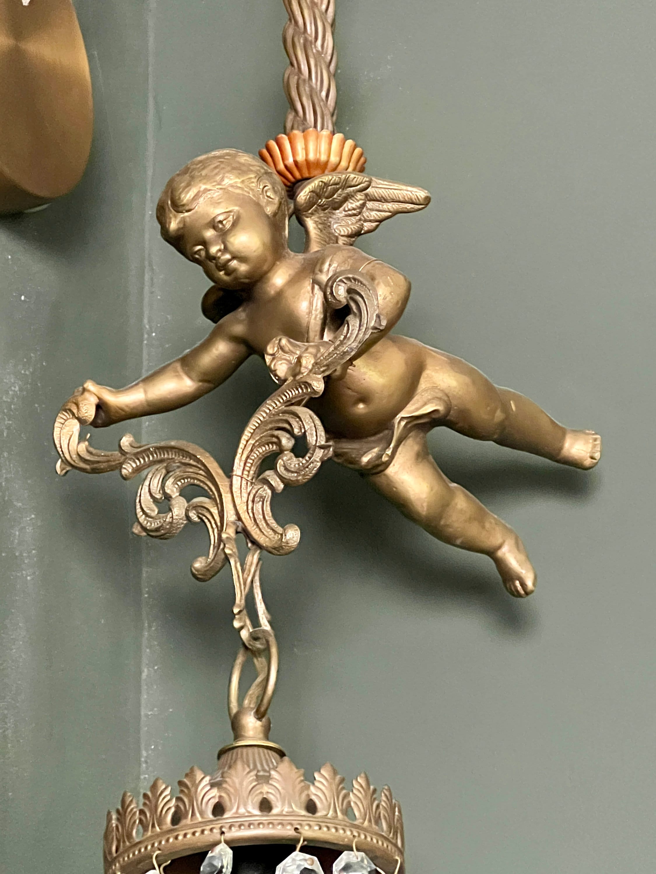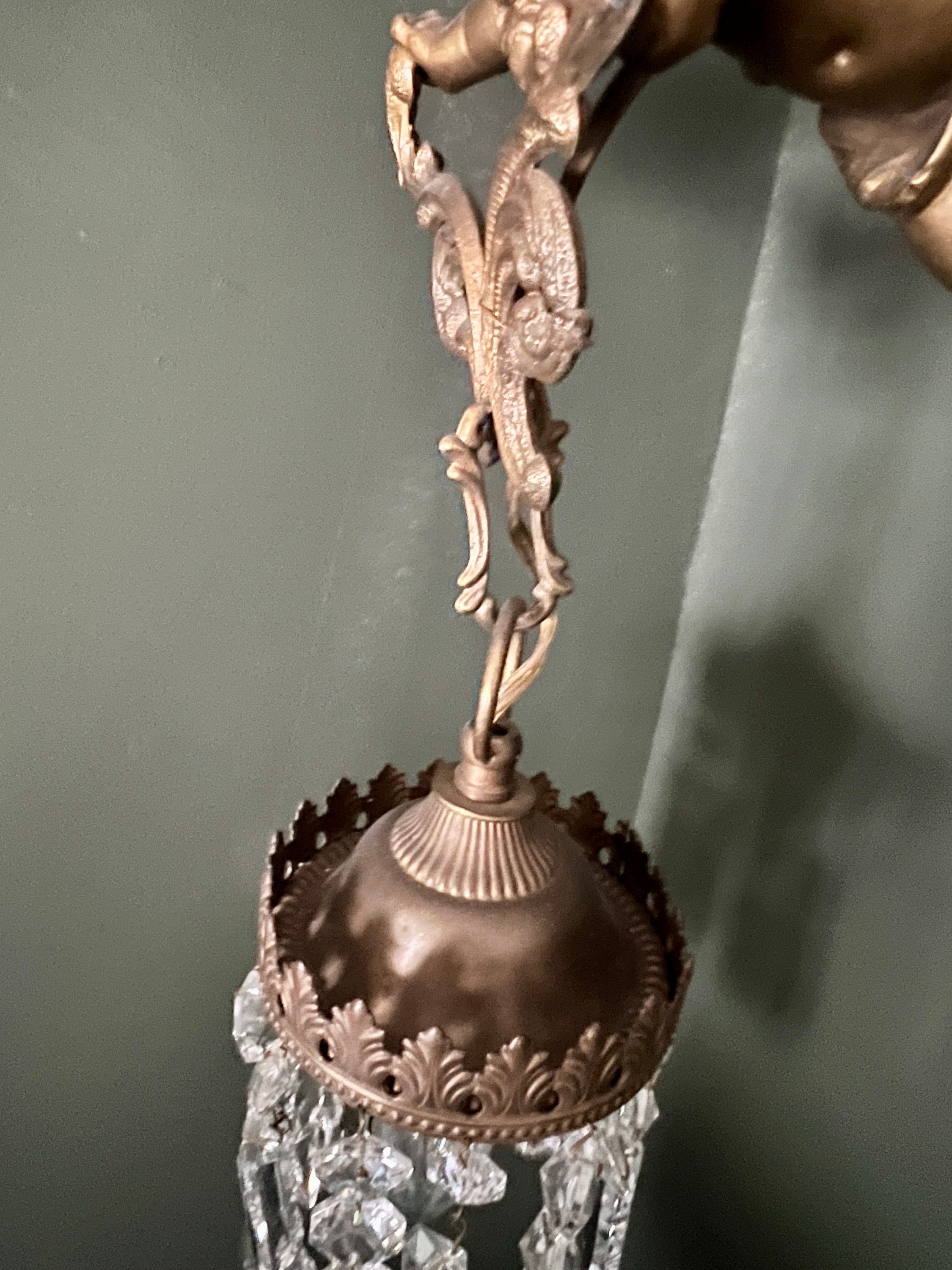 原创新艺术风格吊灯,带有青铜飞翔的小天使和水晶玻璃,约 1915 年。青铜复古天使吊灯 17800.00元
