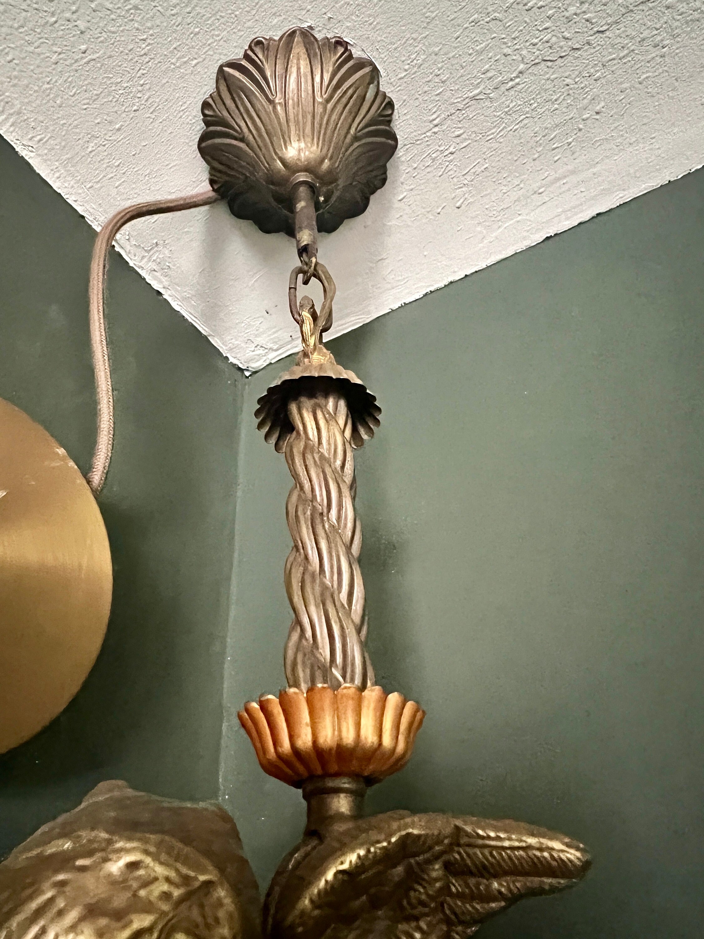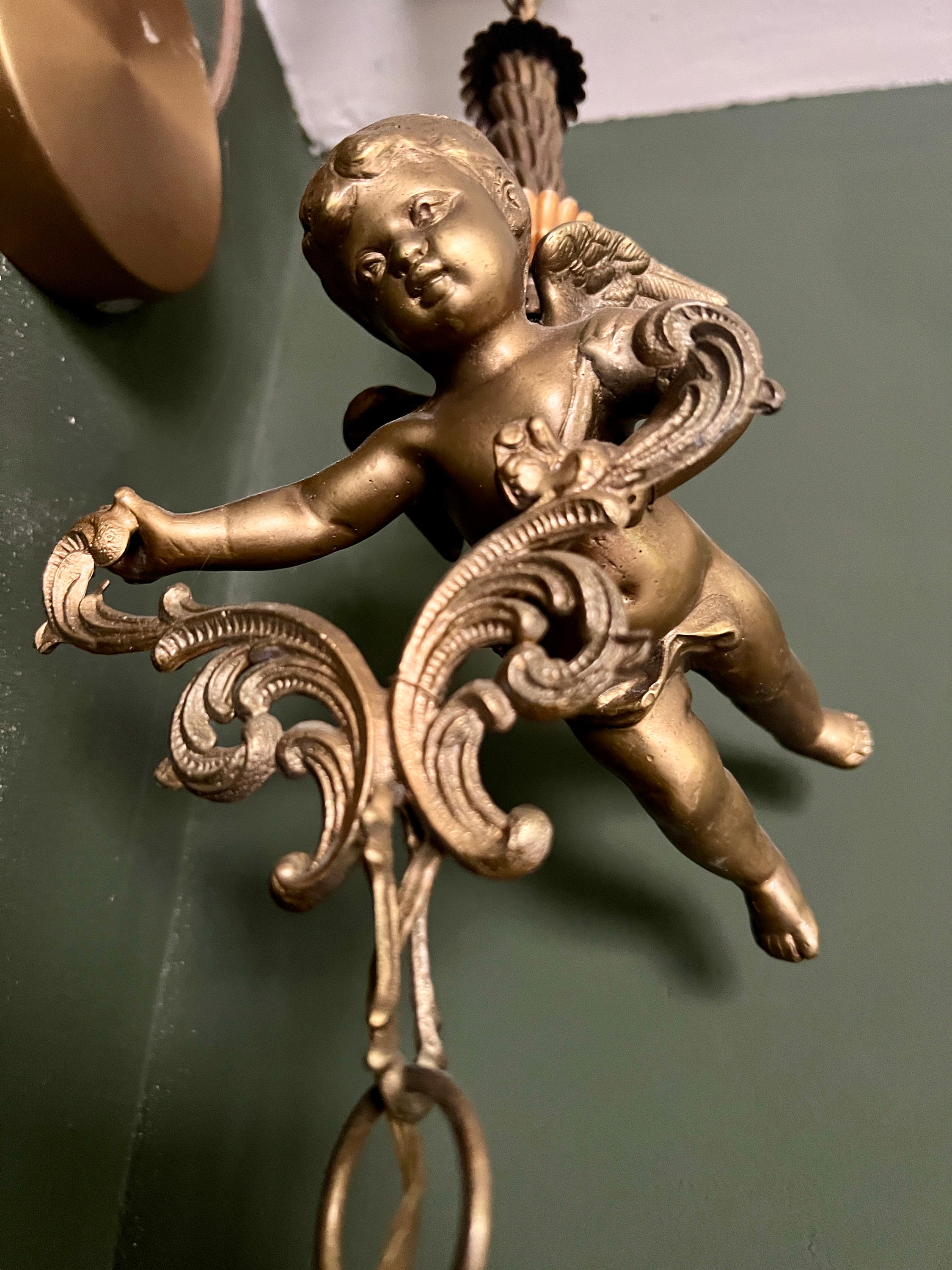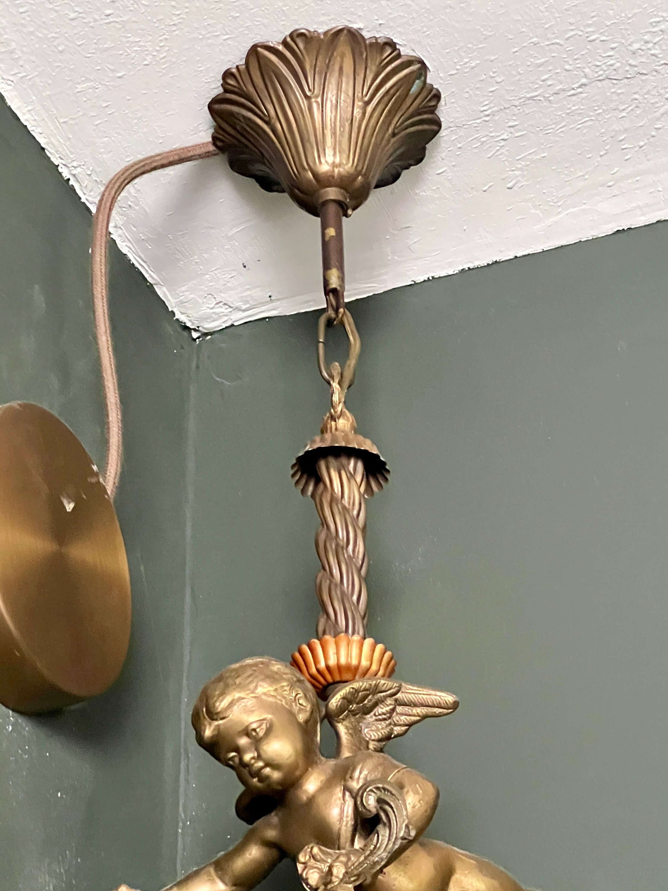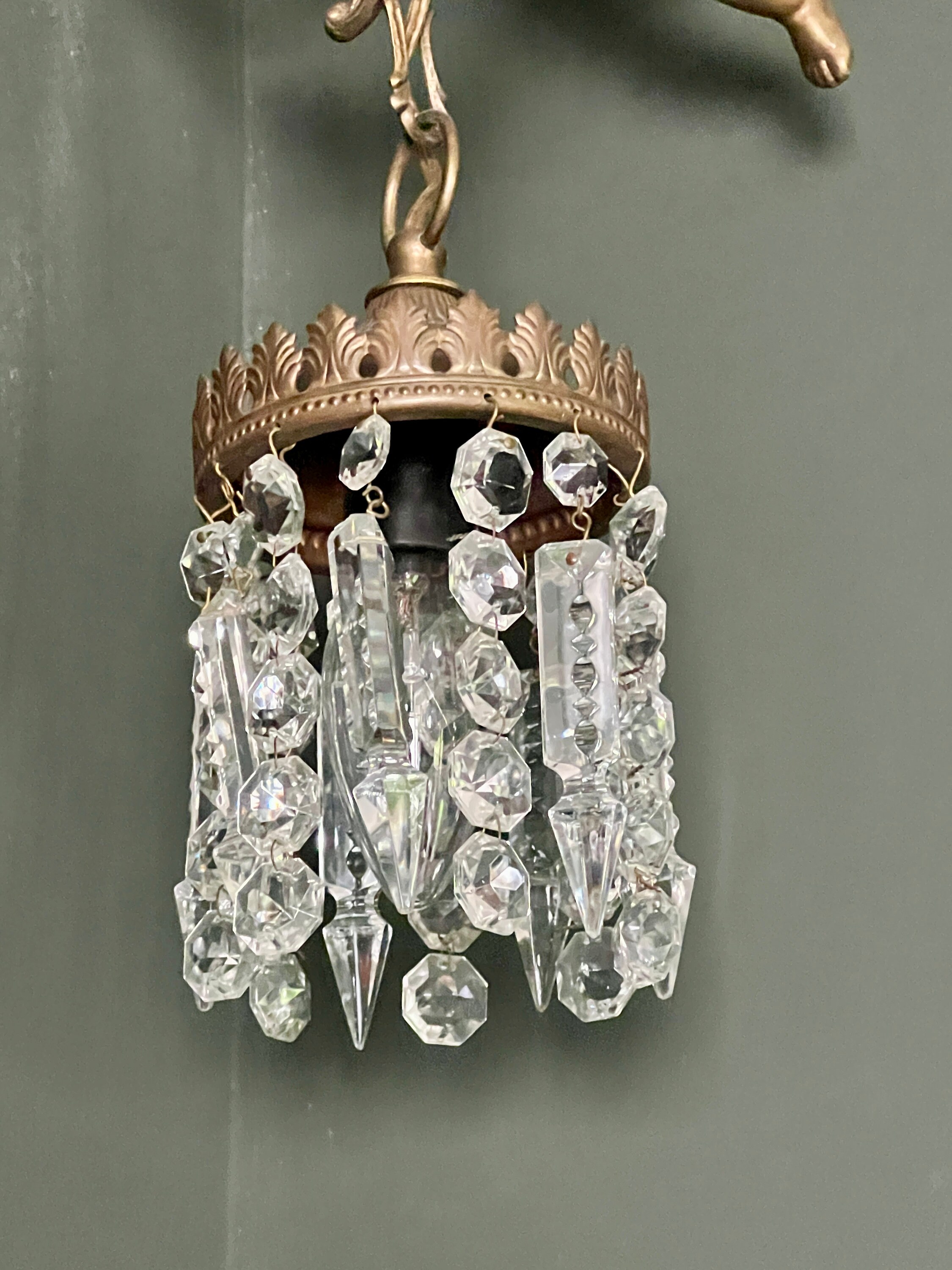 原创新艺术风格吊灯,带有青铜飞翔的小天使和水晶玻璃,约 1915 年。青铜复古天使吊灯 17800.00元